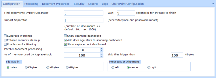 - Parallel document processing - this setting configures number of documents that ReplaceMagic will process in parallel. This number is limited by hardware power (CPU, memory, IO) and on each computer can be different. Default is 10 but you can experiment and change this number based on hardware usage during processing. Keep in mind that more does not mean faster - if you set 100 but your computer can process only 20 there will be a lot of CPU waits. Use Task Manager to check hardware usage.