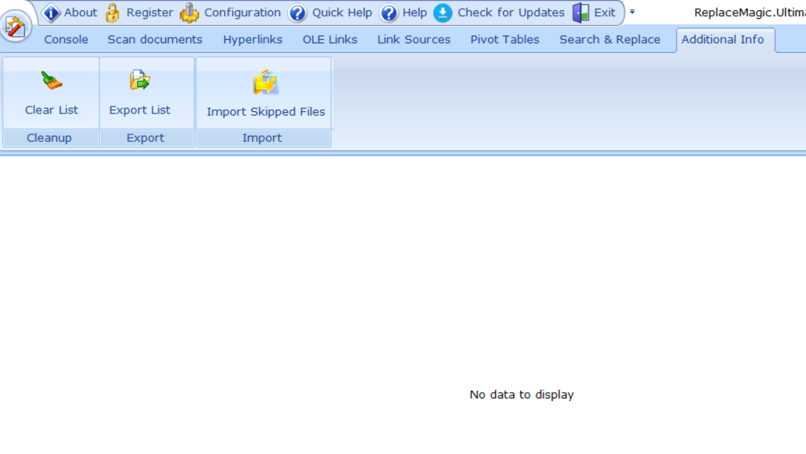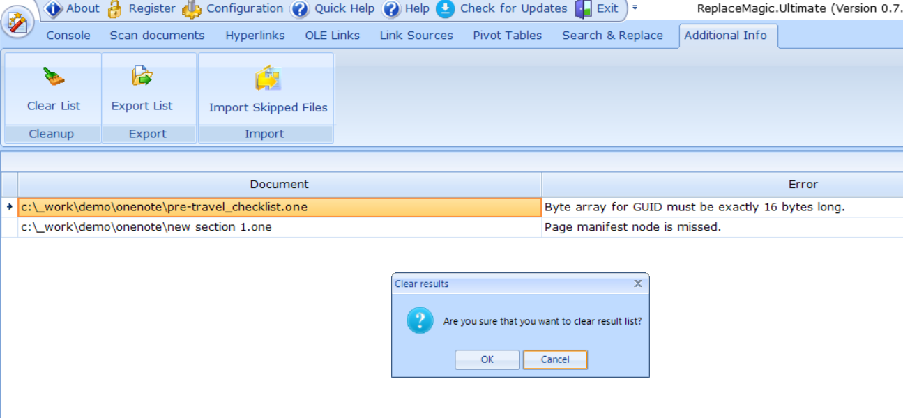 Skipped Documents tab Clear List Clear List Previous Top Next By clicking on "Clear List" button in search & replace tab you will clear content of the results list.