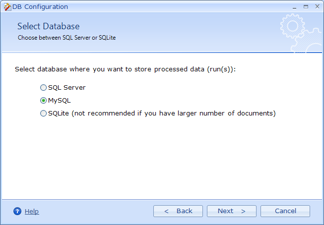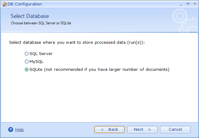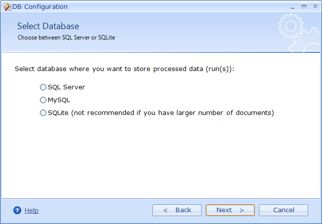 Initial step is to configure which database should be used and that is done over DB wizard (Start Database Configuration):