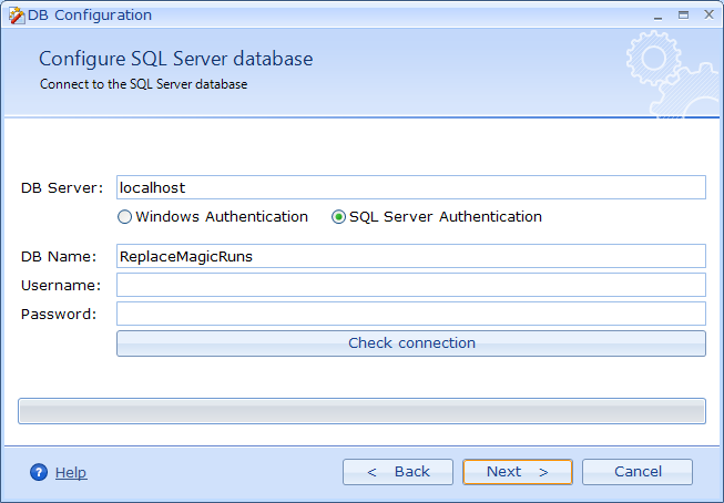 Where you need to select authentication mode => Windows Authentication or SQL Server Authentication. In both cases, when authentication details are provided, click on Check connection as only if it is working you can move to next page: