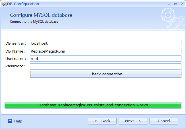 Similar process is for mySQL (user credentials have to work prior to running DB Wizard - user needs to have permissions to create/drop database and create/drop tables):