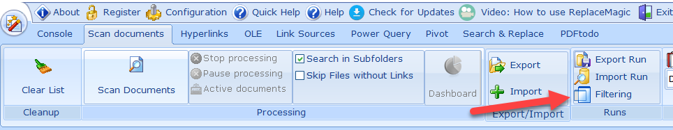 ReplaceMagic supports filtering of documents scanned for later replacement process which is useful in case of SharePoint files as there is not option to select single document(s) thus filtering option can help: