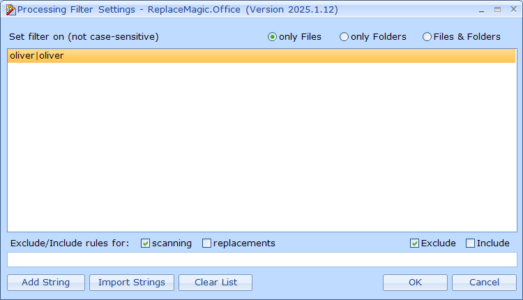 - Select if entered words will be checked against folder name, file name or file and folder name
