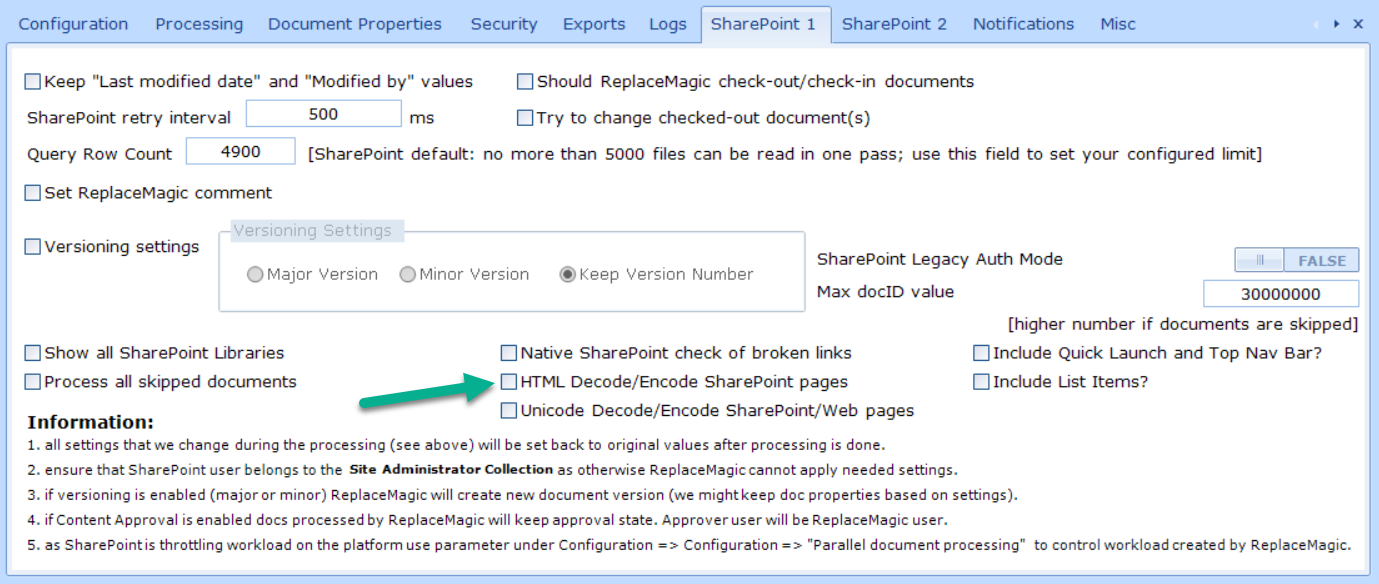 When you process SharePoint .aspx pages and hyperlinks are not recognized most likely .aspx page is HTML encoded. Allow ReplaceMagic to find links in encoded page you will need to set parameter: