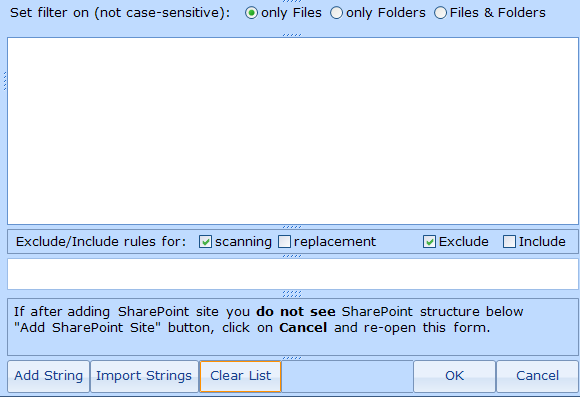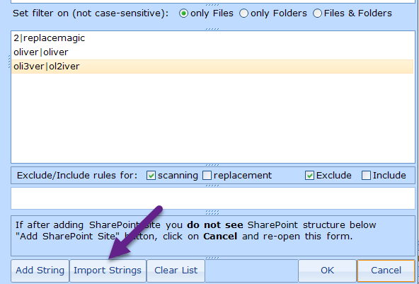 In case that you prepared list of strings for filtering, you can import it over Import Strings. Each string has to be in separate row.