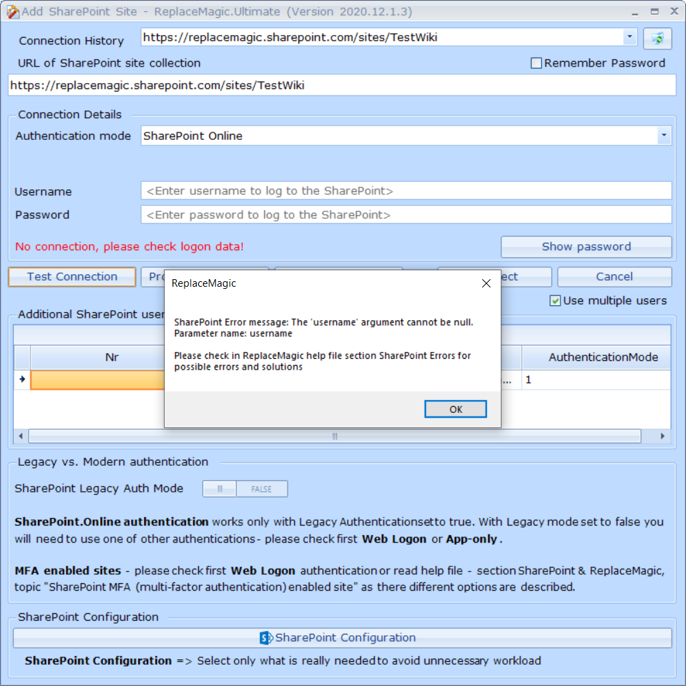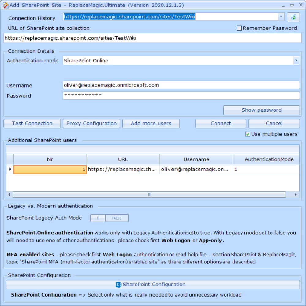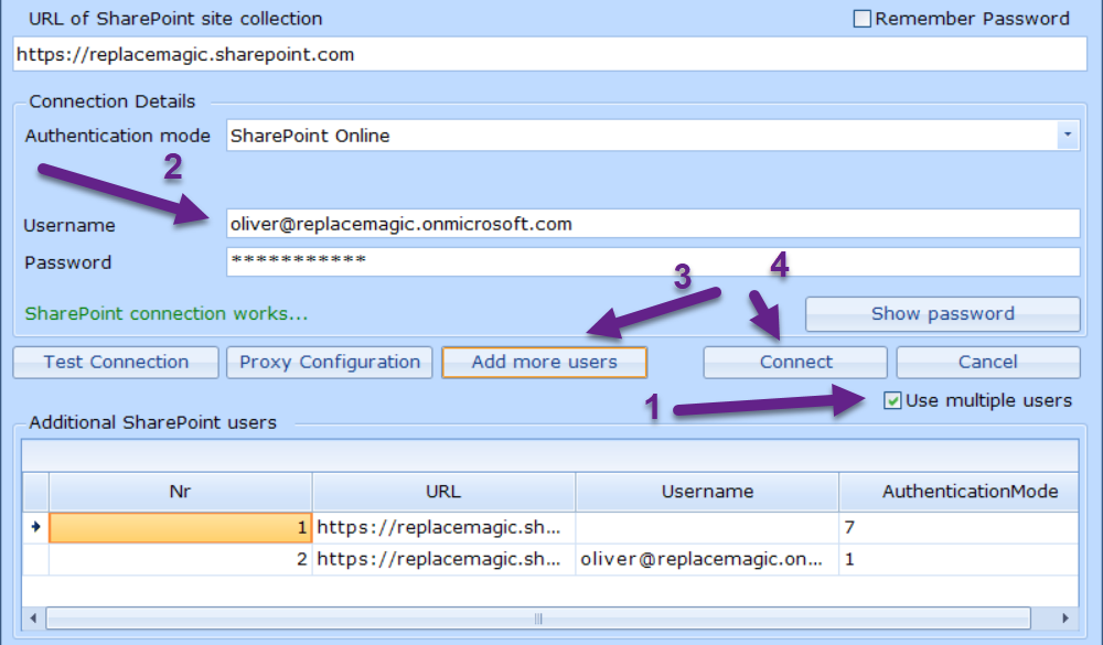 To do that, before you start to enter user credentials click on "Use multiple users" (1) and then when you enter user data (2) click on "Add more users" (3). In case that connection works (you'll be notified) ReplaceMagic will store user data in "Additional SharePoint users" table. Double click on user data in list of all connections will remove that connection from the list. Authentication modes can be different as long as they are allowed to be used by your SharePoint configuration (in screenshot about you can see SharePoint.Online and Web Logon authentication used by same user) but it is our strong recommendation to use the same authentication mode to avoid potential differences between modes (for example, Web Logon does not support changes on hyperlink in list item fields).