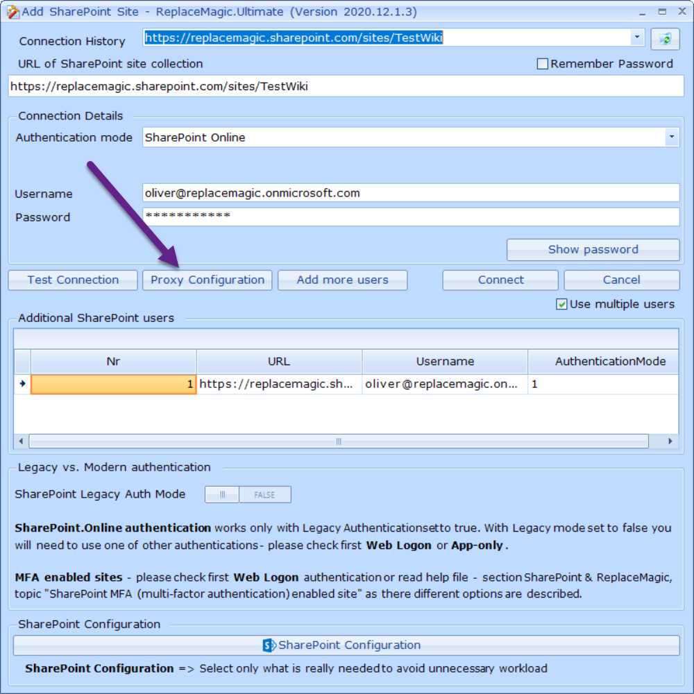 When you entered all user data just click on "Connect" (4) and ReplaceMagic will use last entered used to connect to the SharePoint.