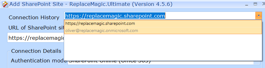 ReplaceMagic will keep last 10 successful connections per Windows user. To use some of used connections just click on Connection History drop-down.
