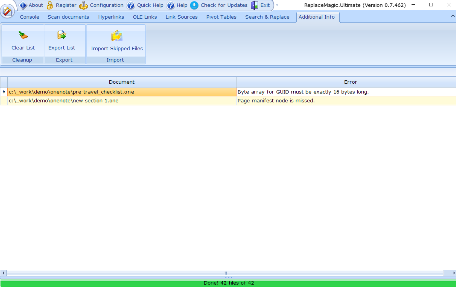 Sometimes during processing documents some file might be damages and for any reason ReplaceMagic cannot open them. Also if document processing is manually stopped or some configuration parameter values are reached documents might be listed here.